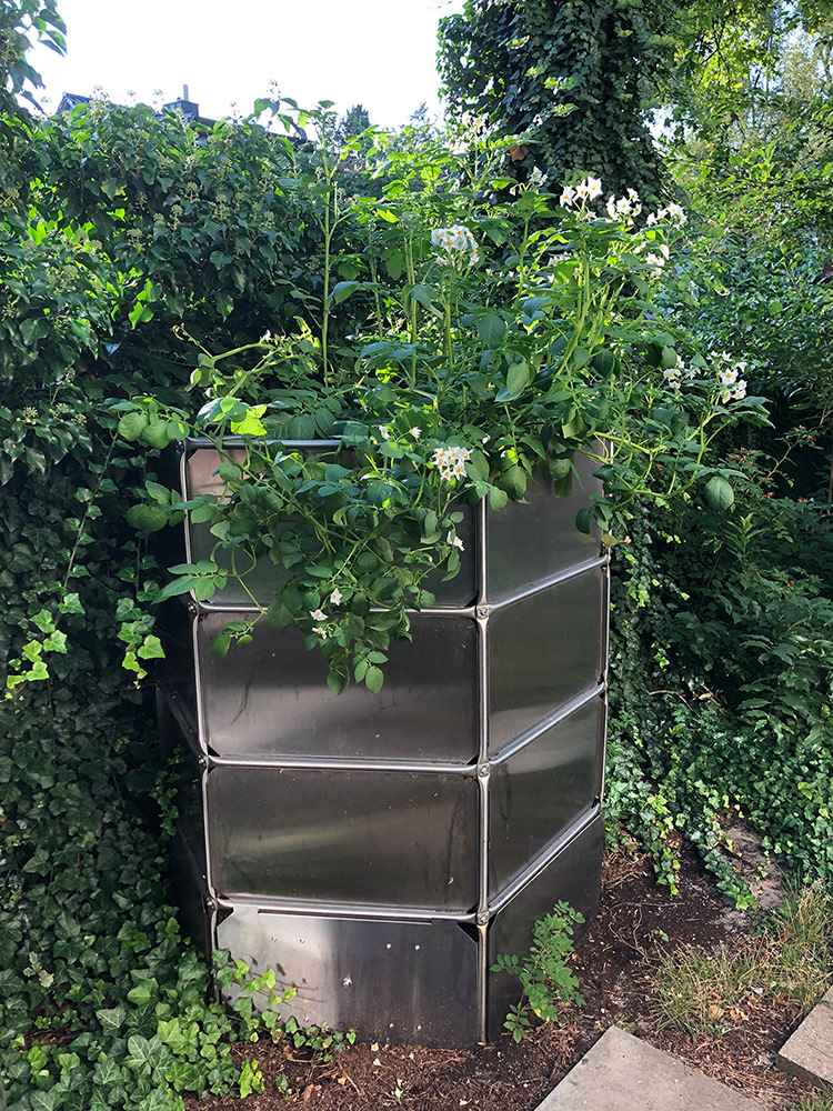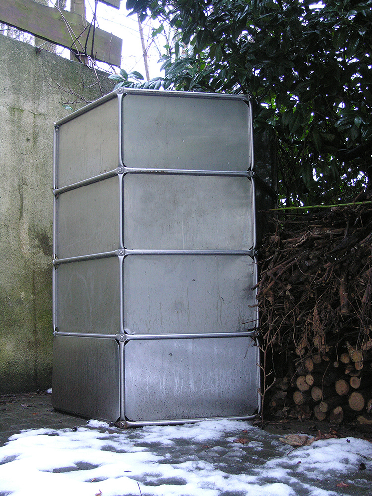 Zusätzlicher Komposter in der Heerstraße 97, in Berlin-Westend. Durch den starken Laubanfall im Herbst wurde es notwendig, einen zweiten Behälter aufzustellen. Das frische Laub, sonstige Garten- und Küchenabfälle werden in den linken Kompostierer gefüllt, von dem unten etwa zweimal jährlich das teilkompostierte Material entnommen und oben in den rechten Behälter umgefüllt wird.