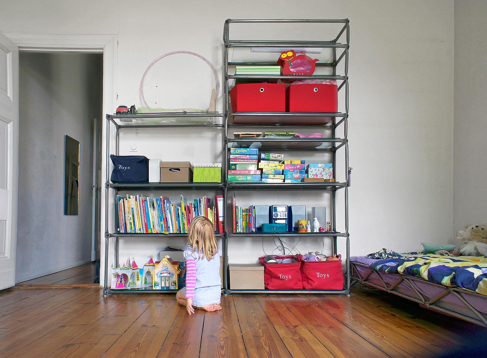 Als erstes Experiment hatte Jürg Steiner, der Erfinder des nachmaligen »Systems 180«, die Rohre dieses Regals in der temporären Schlosserei des Martin-Gropius-Baus gesägt, am Schraubstock gepresst und mit der Ständerbohrmaschine gelocht. Die Stabilität erhält dieses Regal durch die zur Stabachse um 45° versetzte Lage der Abplattungen der horizontalen Rohre, teils nach vorn und teils nach hinten. Das Regal, einst für die eigene Wohnung in der Bleibtreustraße 10 hergestellt, ist immer im Gebrauch gewesen. Das erste Foto zeigt das Urregal im Schlafzimmer der Friedenauer Wohnung 2006. 2016, als das Foto 1 aufgenommen wurde, war es im Zimmer der Tochter in Berlin-Westend. Später empfand sie dieses Regal als nicht zu ihrem Style passend. Ausgerechnet dieses Objekt in ein Depot zu stellen, wäre kaum zu vertreten gewesen, deswegen steht es seit 2020 im Salon (Foto 4). Der seidenmatte Schimmer der Rohroberflächen rührt vom Abreiben mit Leinöl, das primär dem Rostschutz dient.
