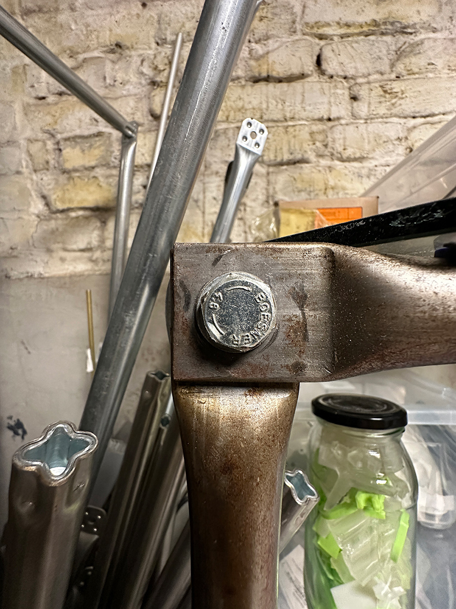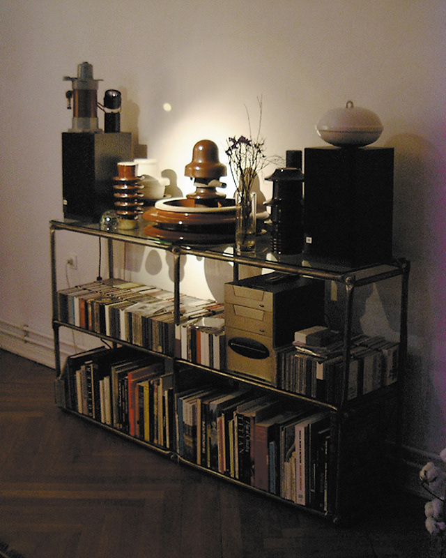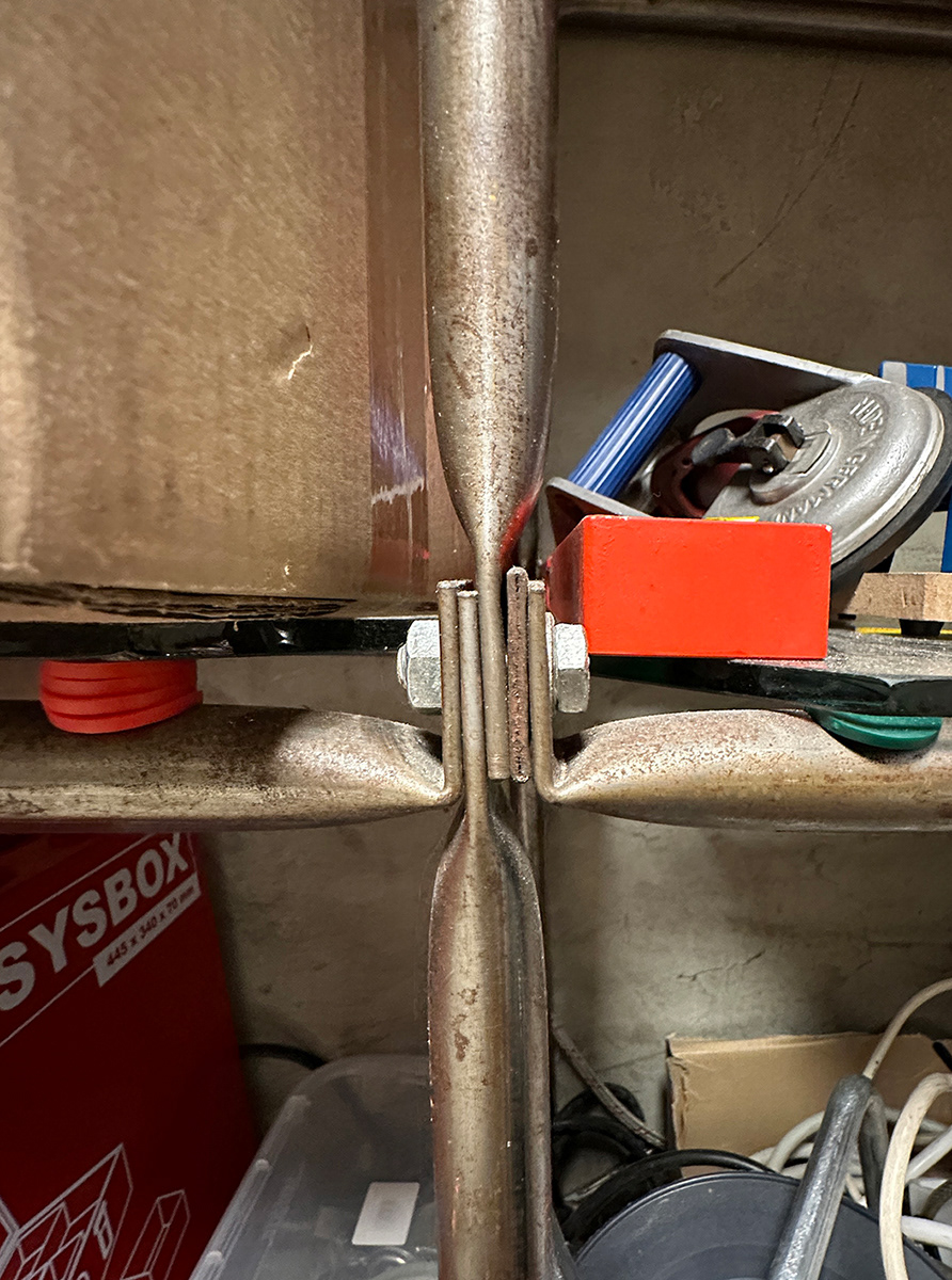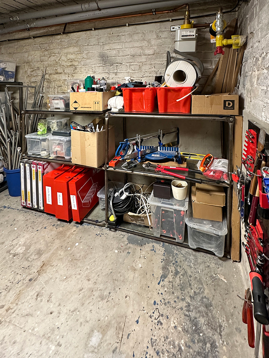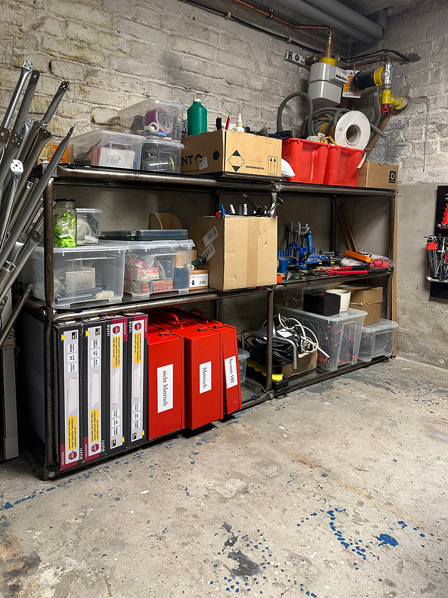 Heute stehen die Regale aus der Ausstellung ›verliebt, verlobt, verheiratet‹ in einem Keller und in der Werkstatt in der Heerstraße 97, haben Flugrost angesetzt und sind in Benutzung. Diese Regale benötigen zwei unterschiedliche Formen der Glasplatten: auf den Ebenen, bei denen die Rohre um 90° nach unten gebogen werden, können rechteckige Platten aufgelegt werden, bei den Ebenen, bei denen die Schraubenköpfe von vorn zu sehen sind, werden die Ecken der Glasplatten über 45° abgetrennt, damit die Platten nicht nur auf den vier sich erhöhenden gepressten Endformen punktförmig auflagern.