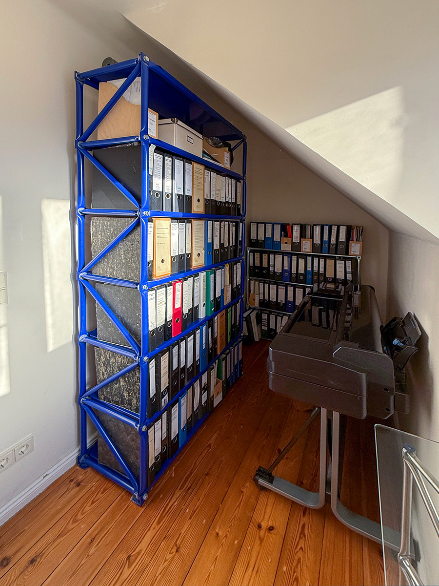 Von den ursprünglich vier Regalen dieses Typus mit ultramarinblauer Pulverbeschichtung sind in der Heerstraße 97 noch drei vorhanden.