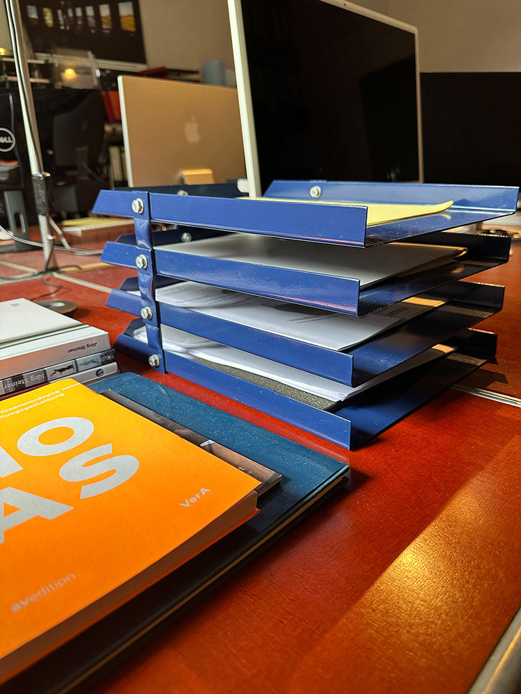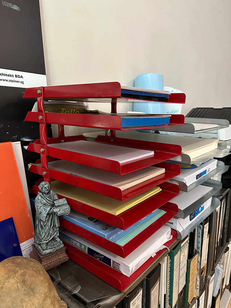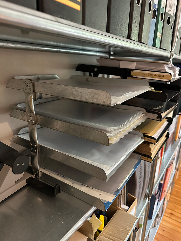 Die hochwertige und äußerst stabile Ablage kann mit beliebigen Fachhöhen erweitert werden und bietet Platz für eine gute Sortierung von Unterlagen im A4- und A3-Format. Solche Ablagen, früher vornehmlich aus Rohr- und Blechresten hergestellt, zeigen den weiten Bereich von Büro-Accessoires, die aus System 180® herstellbar sind. Weiterentwicklungen mit anderen Rohrdurchmessern und Farbkombinationen fächern die Bandbreite auf.