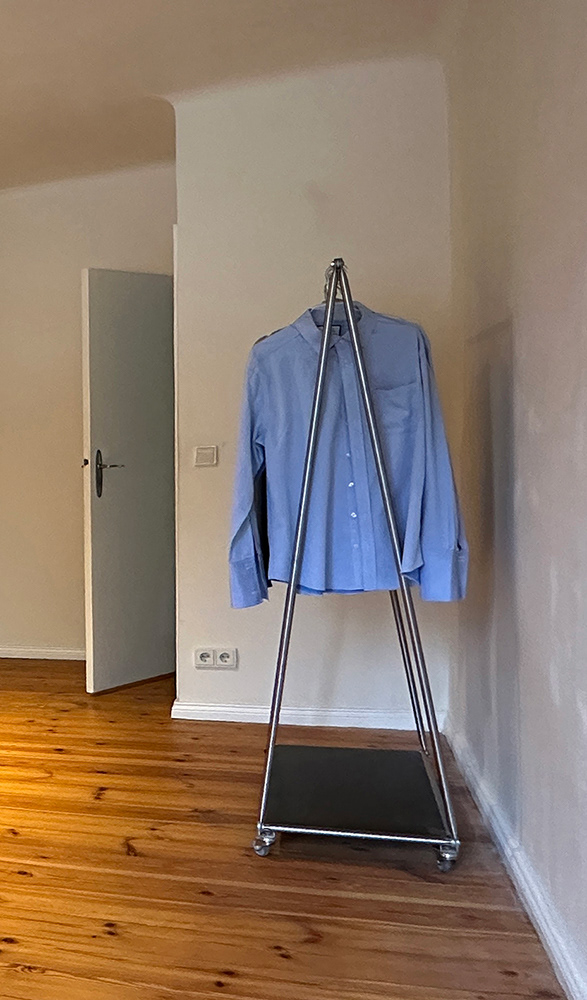 Eine Konfiguration ist prototypisch für das System 180®. Eine rechteckige Basis aus zwei Geraden und zwei Mutternstäben klemmt eine Bodenplatte aus MDF ein. In den Ecken sind Lenkrollen montiert. Je zwei leicht abgewinkelte Geraden treffen sich oben in einem Knoten, der mit dem gegenüberliegenden mit einer Geraden, der Kleiderstange, verbunden ist. Die Stabilität in der Tiefe garantieren die beiden seitlichen Dreiecke, die Steifigkeit der Breite ist den verbreiterten Profilen der Rohrenden im Zusammenspiel mit den Noppenverkrallungen geschuldet. Die Sinnfälligkeit von Konstruktionen aus System 180® ist bei diesen Garderoben besonders einfach nachvollziehbar.