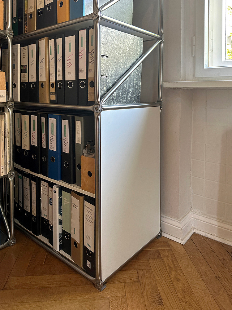 Dieses Regal in der Bibliothek im Hochparterre wurde 2014 als Standardware gehandelt. Im 720 mm hohen unteren Bereich sind Zwischenböden mit Trägerstiften in senkrechten Lochreihen einzusetzen, darüber bauen sich sechs 360 mm hohe Fächer auf.