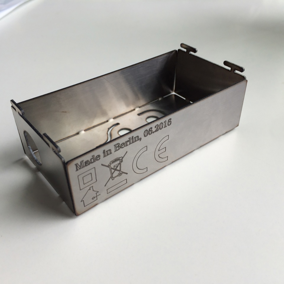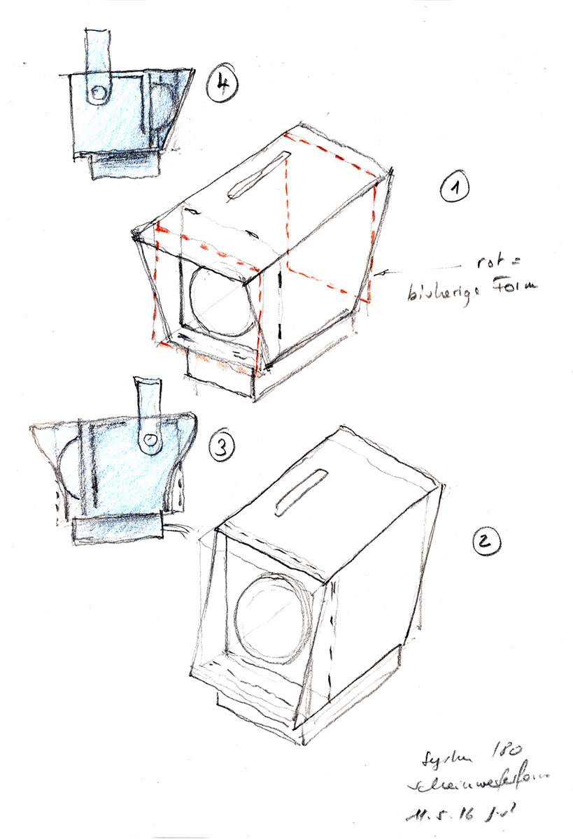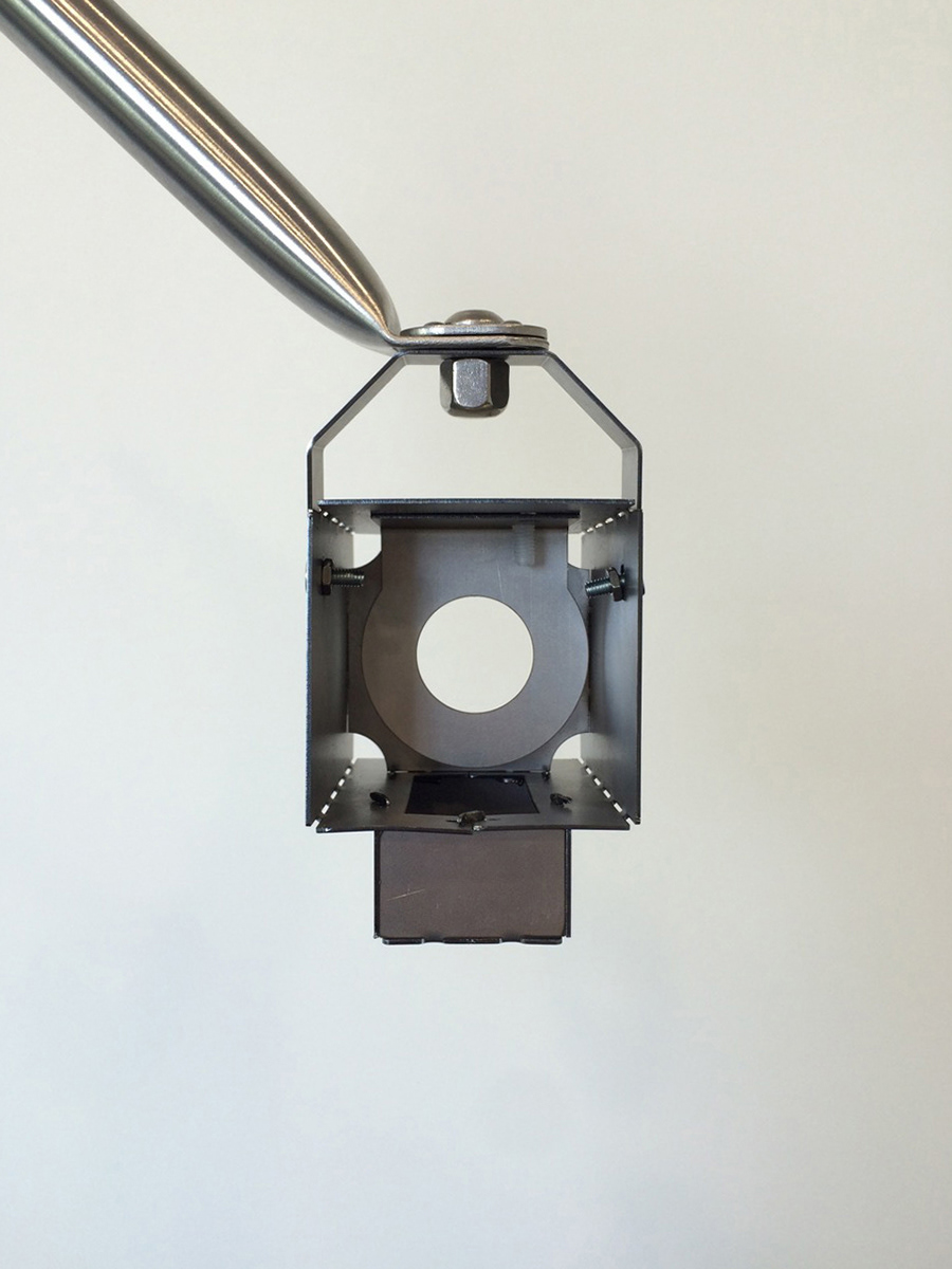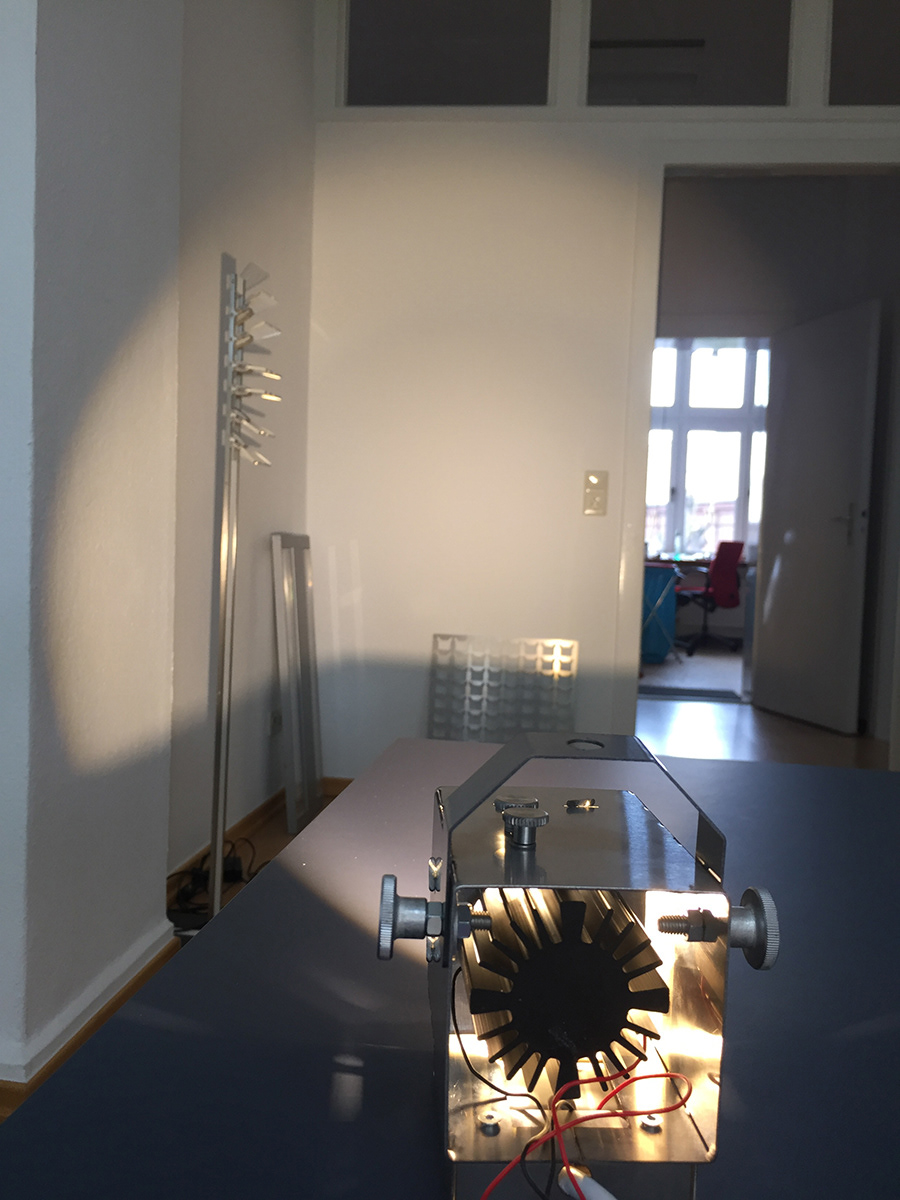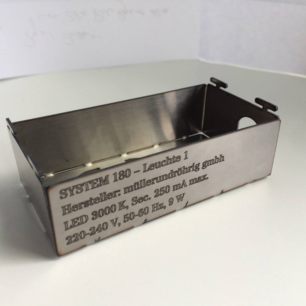 Hinter einer feststehenden Plankonvexlinse ist ein LED-Chip mit einer Leistung von 8 Watt in der Längsachse verschieblich stufenlos so festzusetzen, dass sowohl eine punktförmige Lichtwirkung (14,5°) als auch stufenlos ein recht breit strahlender Lichtaustritt (68°) erreichbar sind. Da solche LED-Lichtquellen empfindlich gegen Überhitzung sind, wurde hinter dem Chip ein großvolumiger Kühlkörper eingebaut und das Vorschaltgerät in einem separaten Korpus unter dem eigentlichen Leuchtengehäuse angedockt. Das Gehäuse stellte System 180 aus 0,8 mm starkem Edelstahlblech so her, dass die Abkantarbeiten, ähnlich wie bei Kartonageprodukten, von Hand gebogen werden können. Um dies zu erreichen, sind die Biegekanten perforiert, was auch einer guten Durchlüftung des Gehäuseinneren entgegenkommt. Da die Bleche lasergeschnitten werden, konnten wir ein Verschluss-System entwickeln, das ohne Gewinde, Muttern oder Schrauben eine angemessene Festigkeit aufweist.