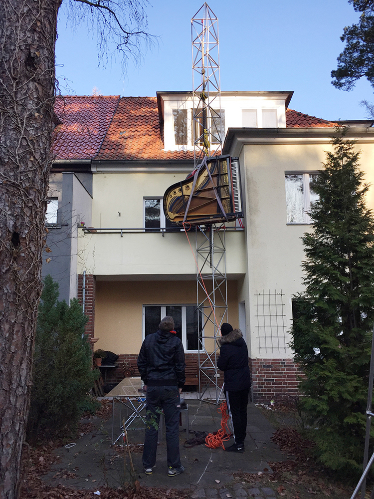 Die Erstnutzung des noch zwei Segmente höheren Trägers diente dem Hochziehen eines Salonflügels am 29. Dezember 2015 auf der Rückseite des Hauses.