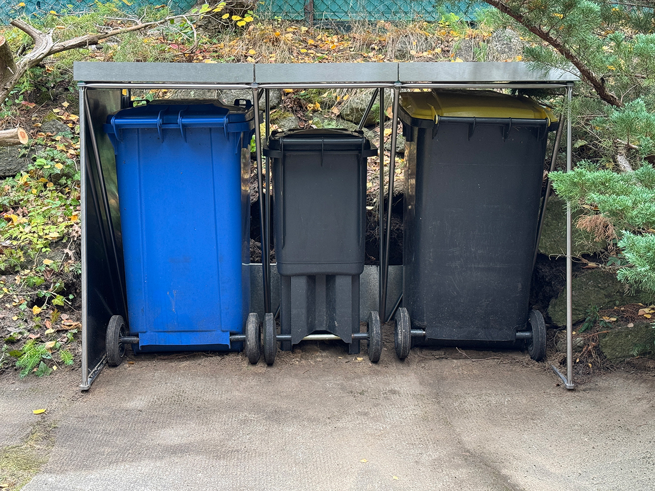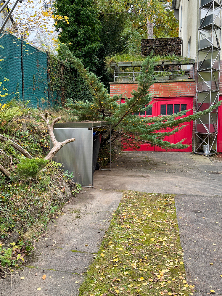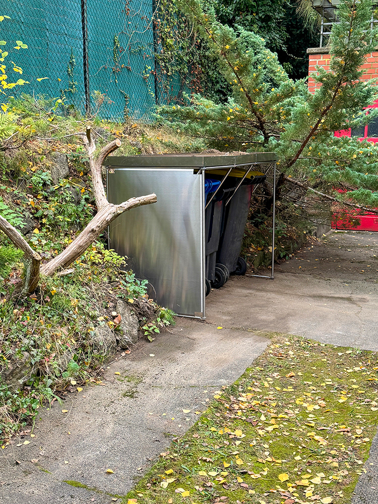 Halb eingegraben in einen Abhang, schützt das Gehäuse drei Mülltonnen. Die beiden breiteren Bereiche sind für Kunststoff- und Papierabfälle, in der Mitte bleibt der Platz enger für den Hausmüll. Für Küchen- und Gartenabfälle dienen die Kompostierer (Objekt 2015/01/02), die auch als Teil der Sammlung auf dem Grundstück in Gebrauch sind.